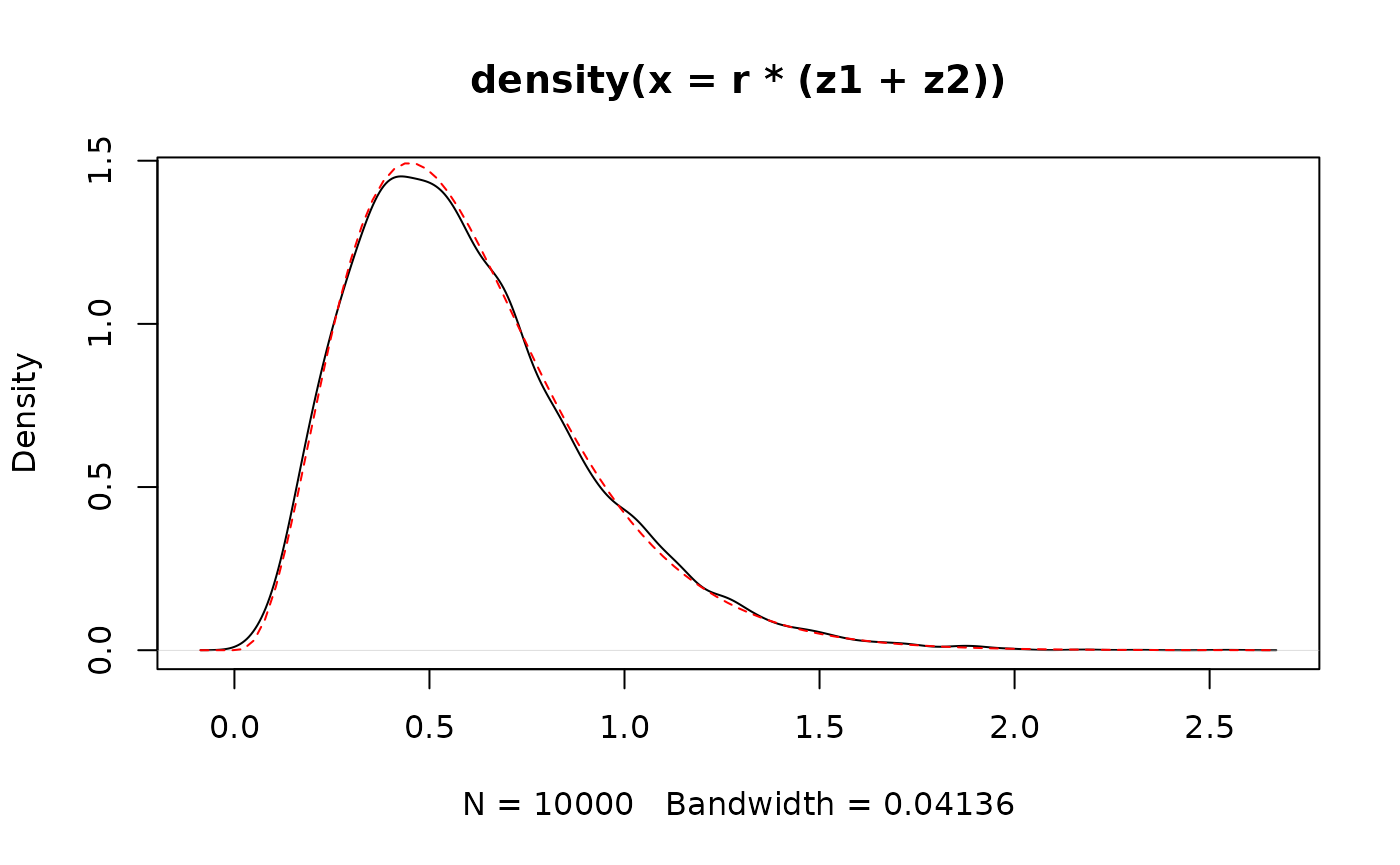 curve(dgamma(x, a1 + a2, b / r), add = TRUE, col = "red", lty = 2)