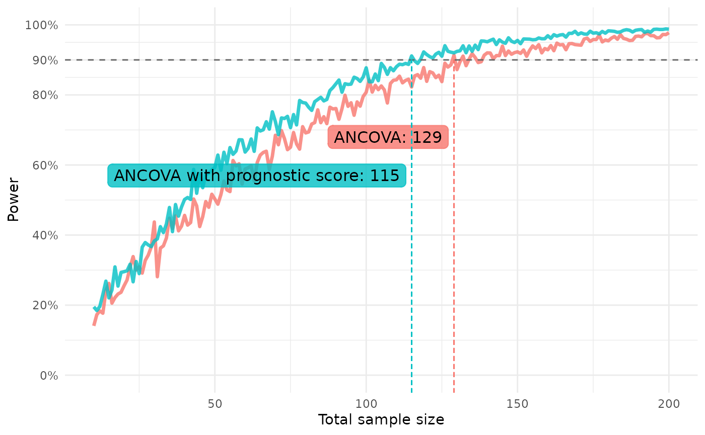 var_bound_prog <- variance_ancova(Y ~ W + .pred, data = dat_notreat)We can then estimate the power for a certain sample size using